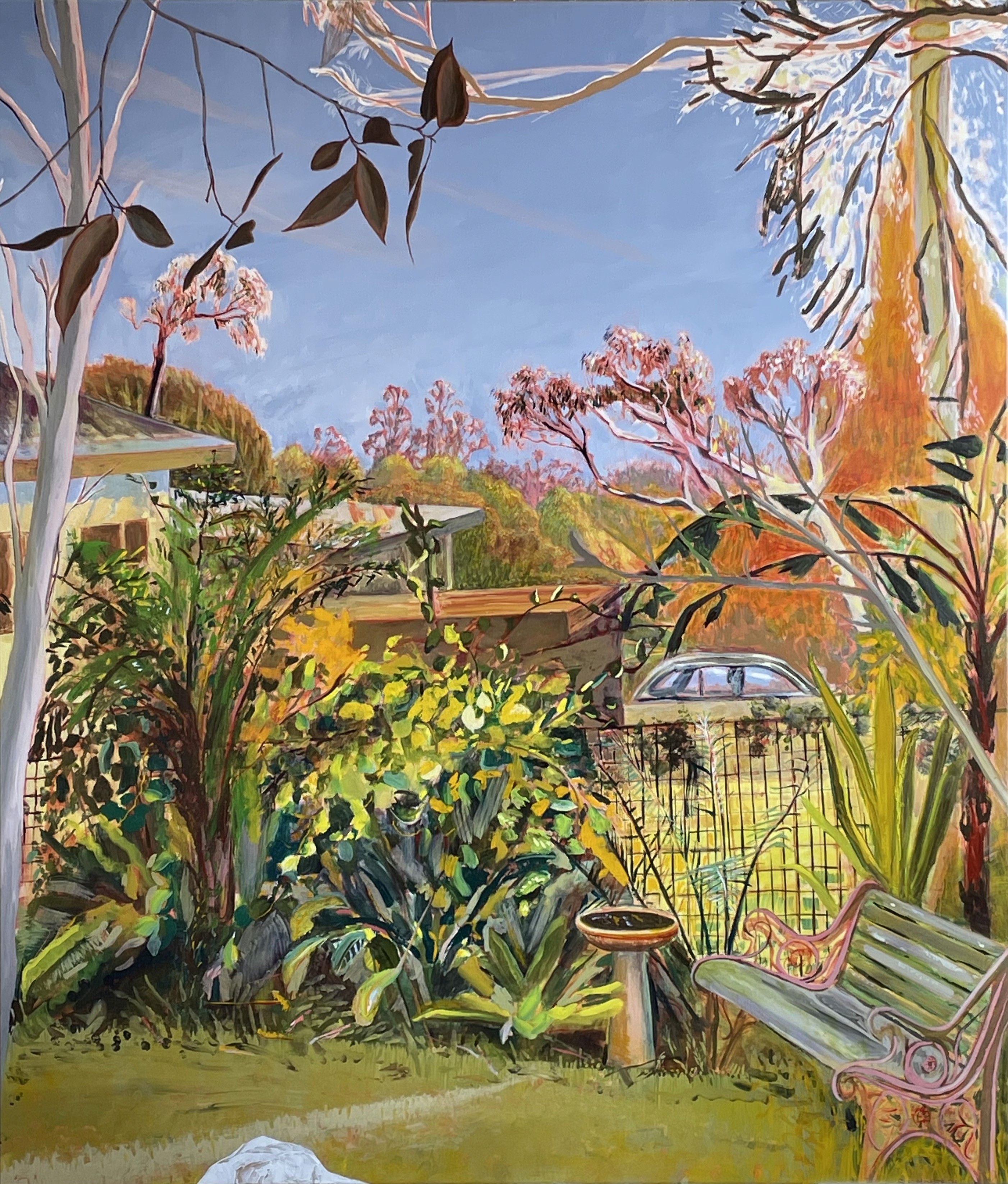 Stephanie Monteith observes objects, interior spaces, landscapes, people, and animals, and their interactions with one another. She is interested in the wonder and interconnectedness of all life. The paintings in the exhibition are from her Suburban Garden Series, a series depicting her lush garden on the outskirts of Sydney, Australia. She completes her radiant canvases en plein air. “In the mornings the sun comes into the garden and creates color spaces which I observe. I see differences in tone, light and atmosphere changing all of the time and I respond with paint.” The artist originally set about making a garden that would be interesting to paint. She selected and arranged native Australian plants chosen for their color and texture, amongst some already established vegetation. Having explored this subject from 2018-2022, Monteith created four new garden paintings in 2024 for this exhibition that capture natural transformation and the mood of a place over time.