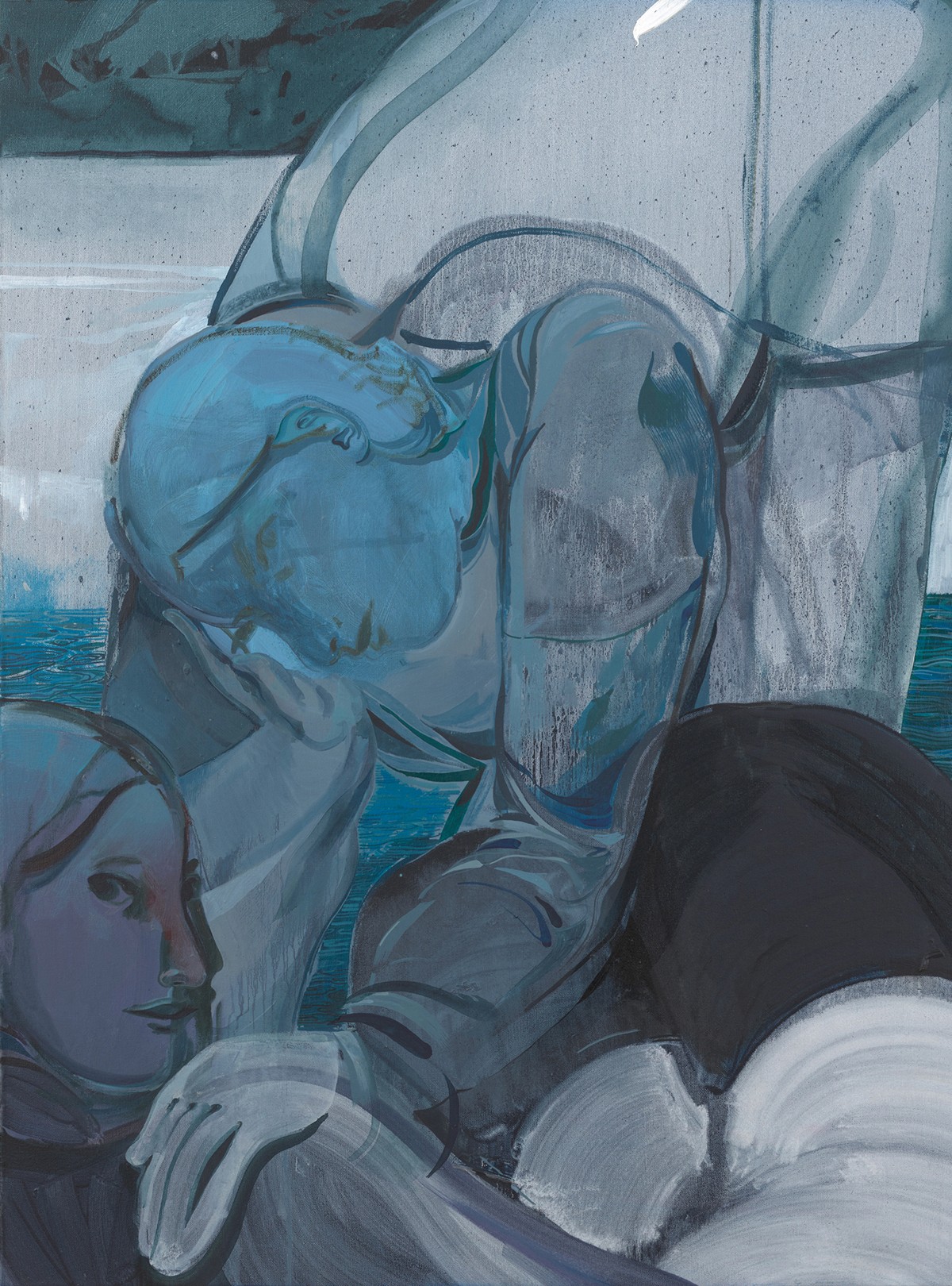 Galego grew up in Cascais, Portugal, between the Sintra Mountains and the Atlantic Ocean, a coastal town whose biodiversity profoundly influenced her imagery and imagination. She probes viewers to question the nature of innocence, purity, and care, in compositions that combine the spiritual and physical realms. Her works are recognizable by their vibrant colors and mystical compositions, often painted in cool and earthy tones that feature figures, arms, or hands in gestures of embrace. Her work combines the different textures of oil and acrylic paint, pastels, charcoal, unconventional materials like glitter, and even different types of fabrics and surfaces.