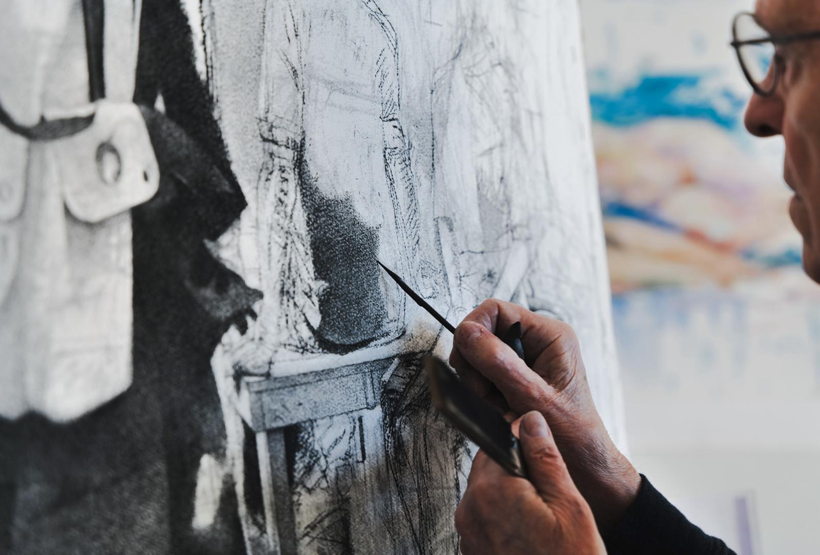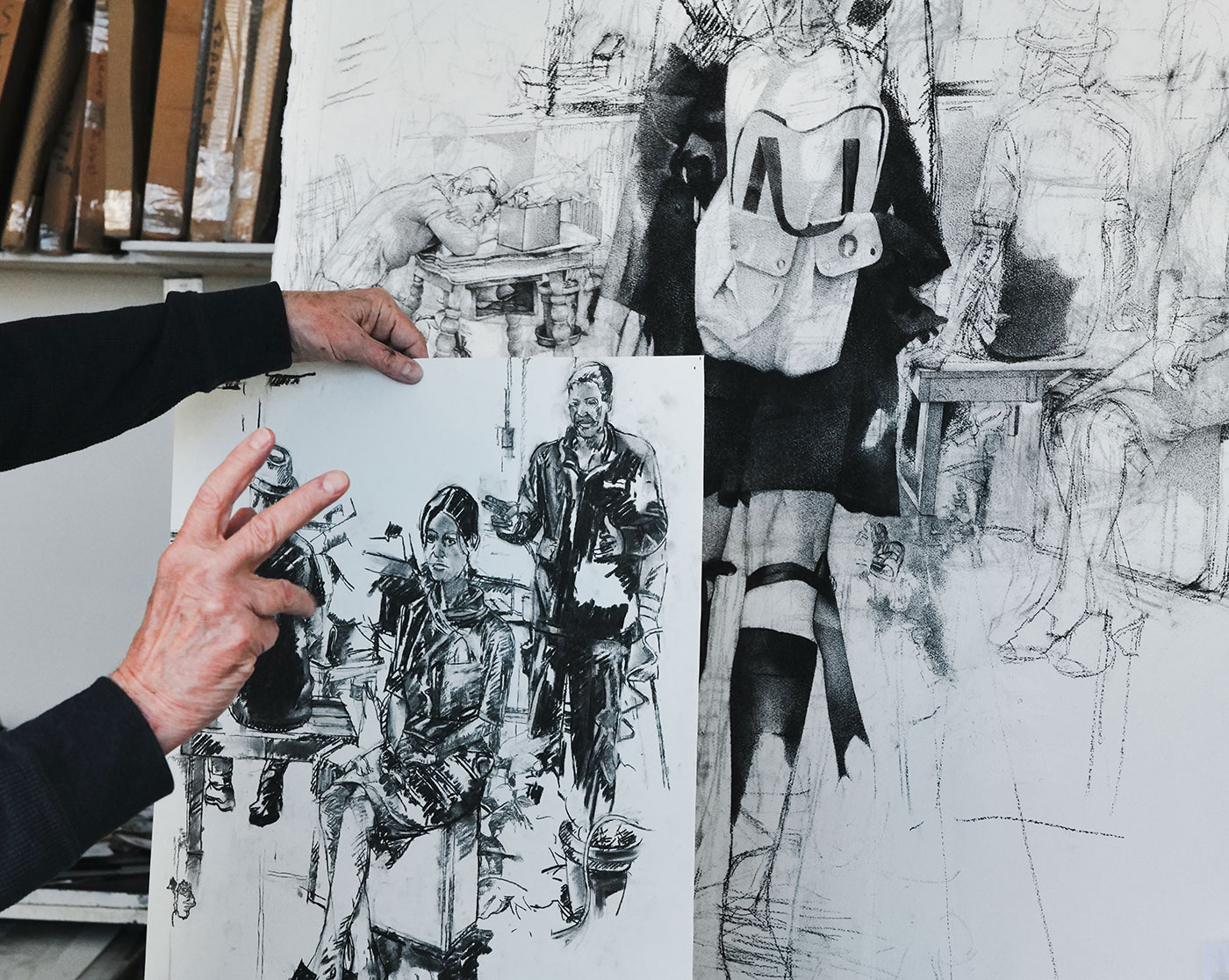 Joseph Santore’s paintings speak to us of ourselves. They lift the shroud on humanity, and communicate with us on the very singular, unique nature of consciousness, and being embodied in this world. His work is uncanny, and arresting, and the canvases are worlds unto themselves, both familiar yet chimerical, where line and paint dance in tandem producing a dynamic vitality, in both objects and figures alike. Santore’s studio brims with curiosities, materials, individuals and plants, all arranged and orchestrated for our contemplation and consumption. Predominantly painting from life, he combines the sacred and the profane in sets of his own design and choreography, juxtaposing seemingly unrelated subject matter and moments in time resulting in canvases that become existential, and reflect the unpredictability, spontaneity and controlled chaos of everyday life.