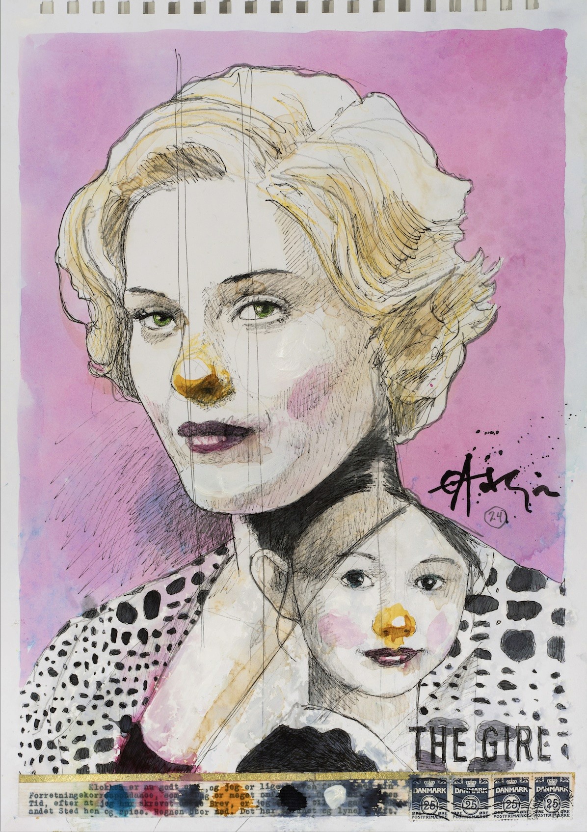 Ole Aakjær is best known for his large-format, highly symbolic works that celebrate the power of women. The distinctive, figurative paintings rely on bold colors and iconography to convey sentiments of empathy, while simultaneously exploring the complexity and strength of their subjects. Ornate ink work comes into play as tattoos are often sprawled across bodies of the figures and various texts inspired by music, literature, film, and religion are meticulously applied with ink.