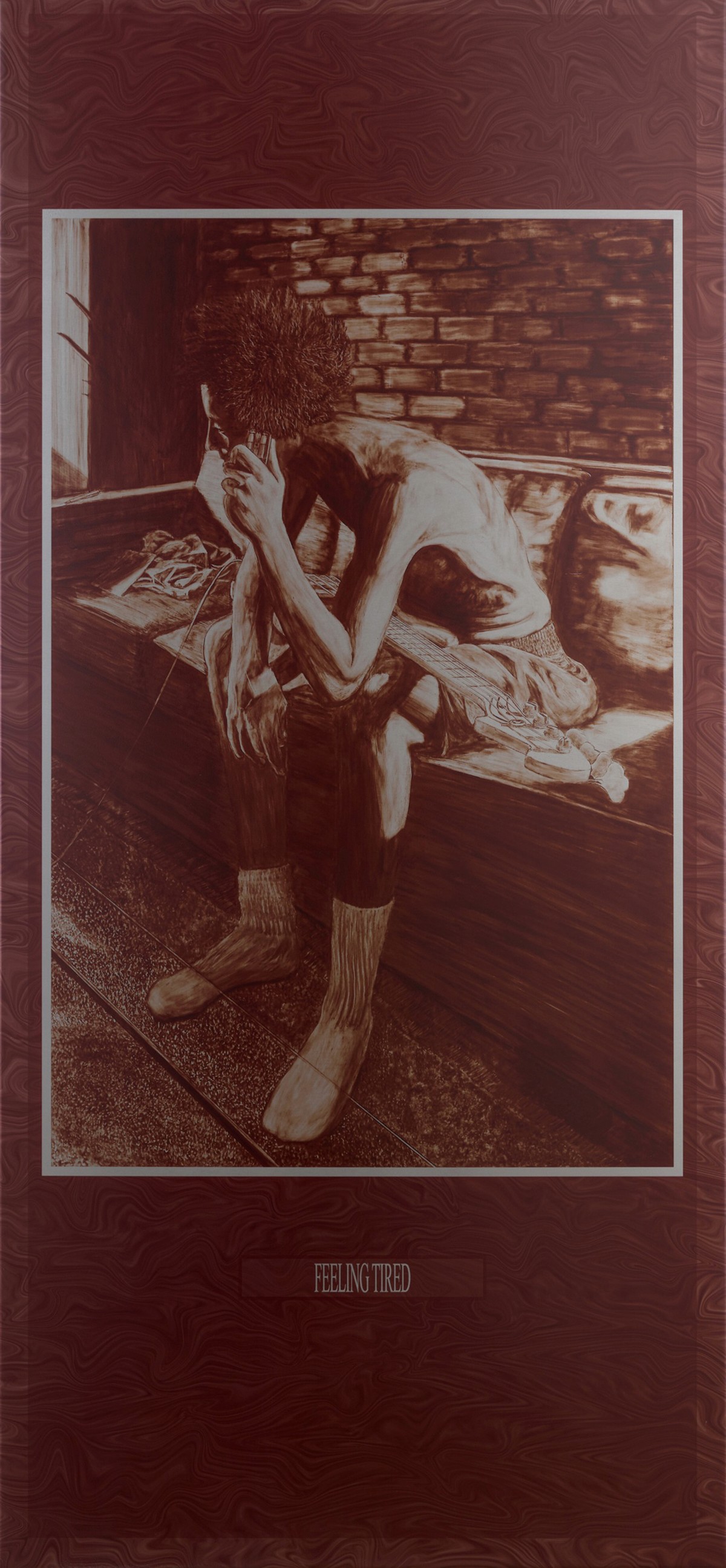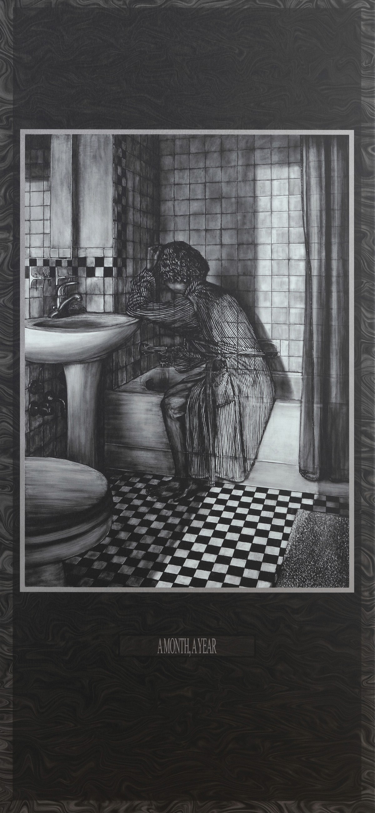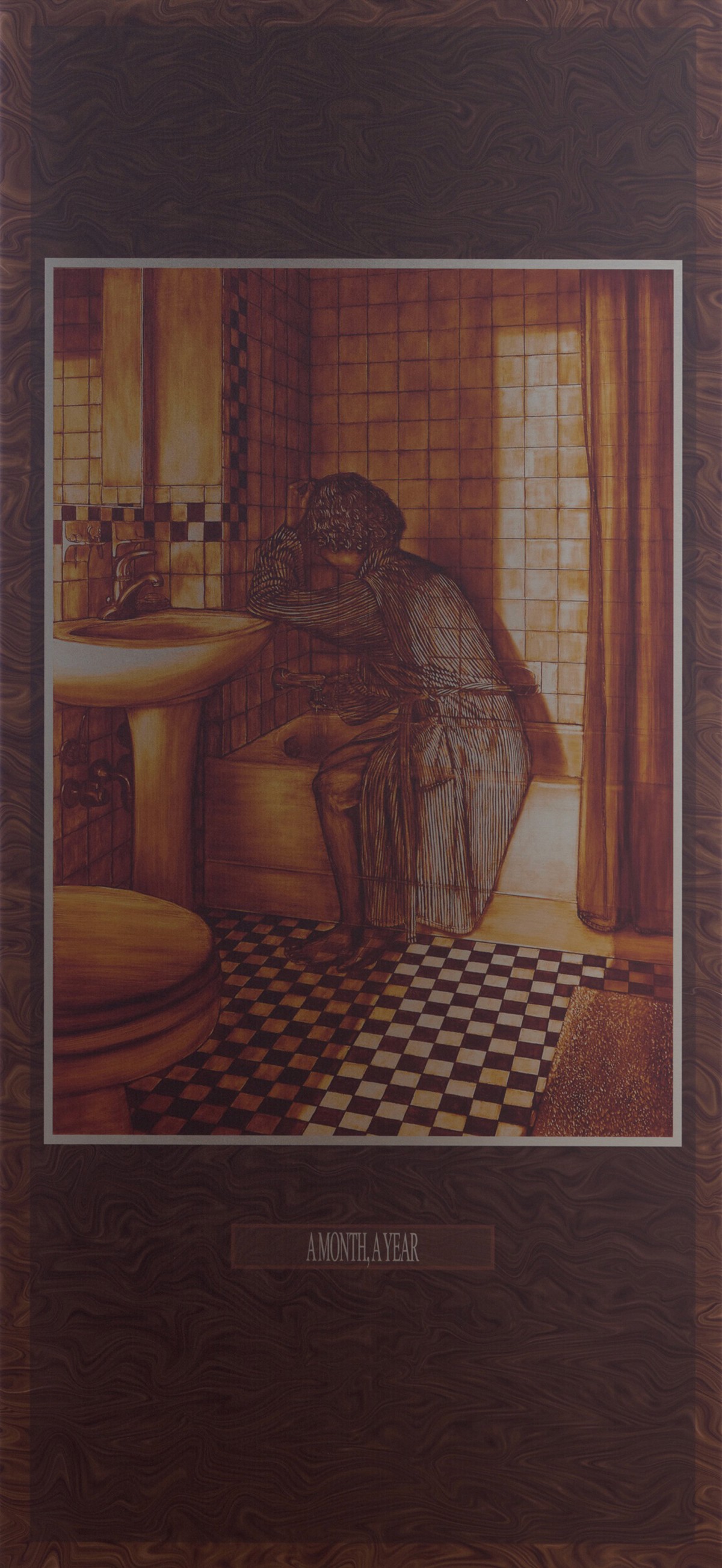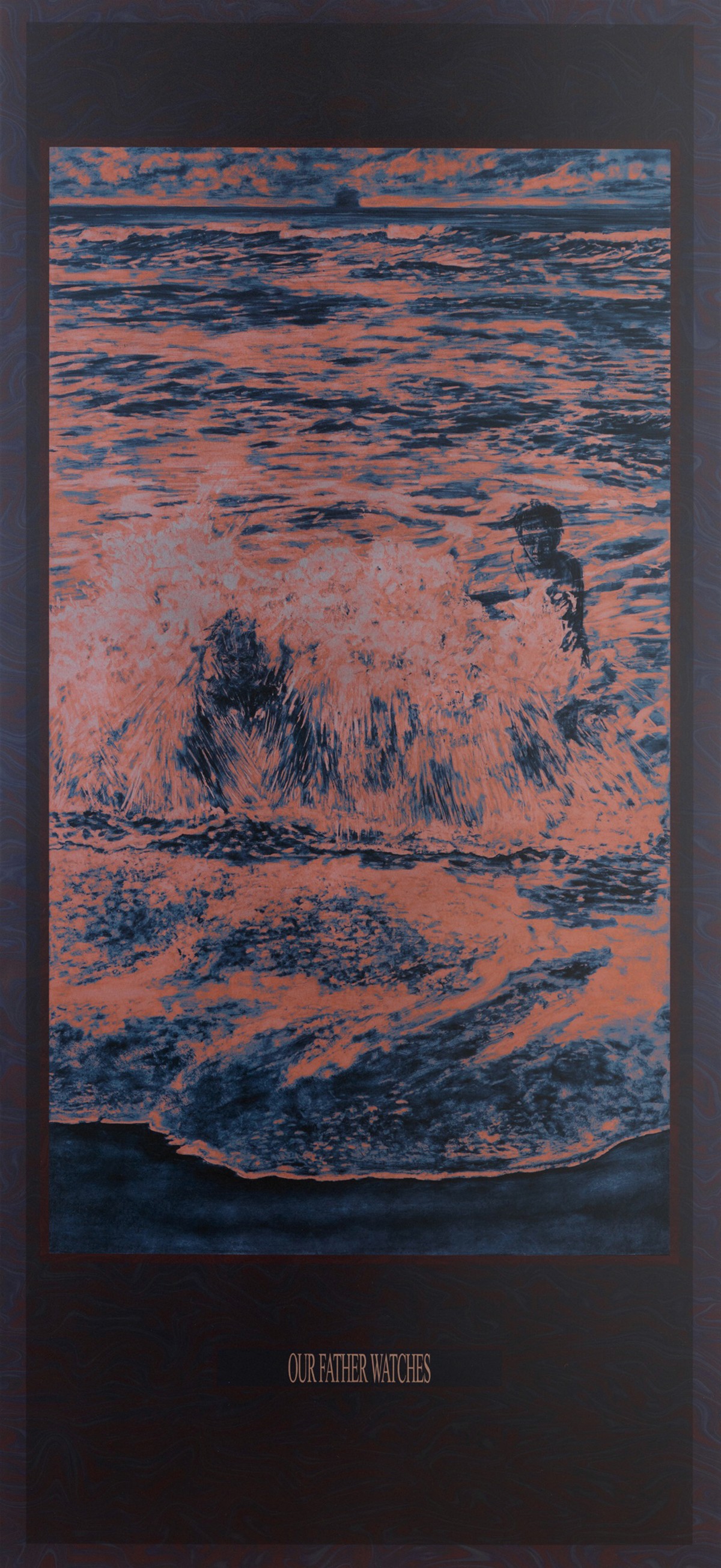 The prints are based off of the artist’s original paintings. The imagery focuses on intimate scenes of emotional moments, such as the work A Month, A Year, which depicts a woman seated on the edge of a bathtub, her head resting on her hand, appearing contemplative or somber. Painted during the Covid 19 pandemic, this image peers into a time of loneliness, fear, and self-care. Our Father Watches is a portrait of two boys in the ocean, one positioned under a crashing wave while the other rises above it. The figures stand as an emblem of community, for the ways in which we rise up when another is knocked down. A distant boat is visible on the horizon line, representing the unknown coming or going. The title refers to the presence of a being outside the frame, such as a parent, God, or teacher, who watches over, weighing the possibilities, circumstances, decisions, and consequences in every moment.
