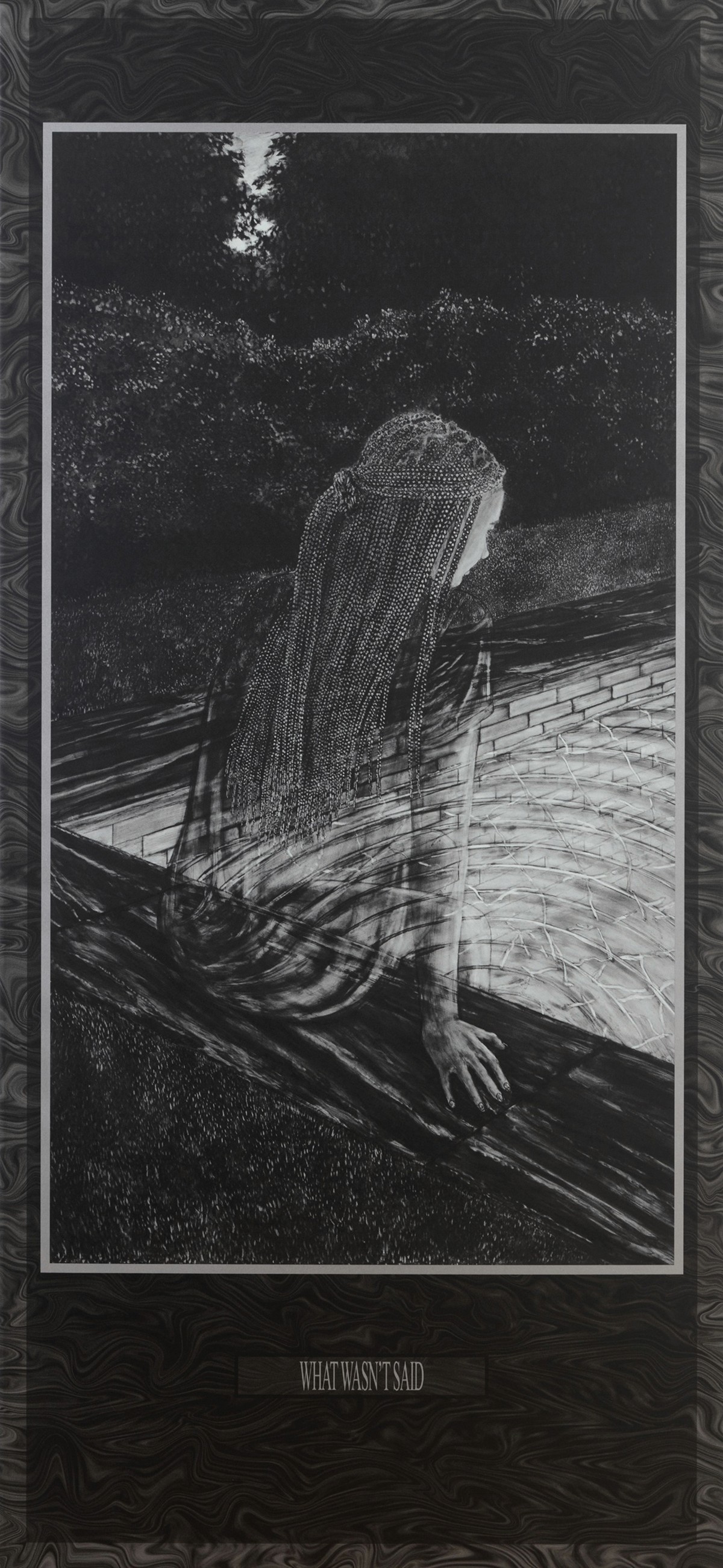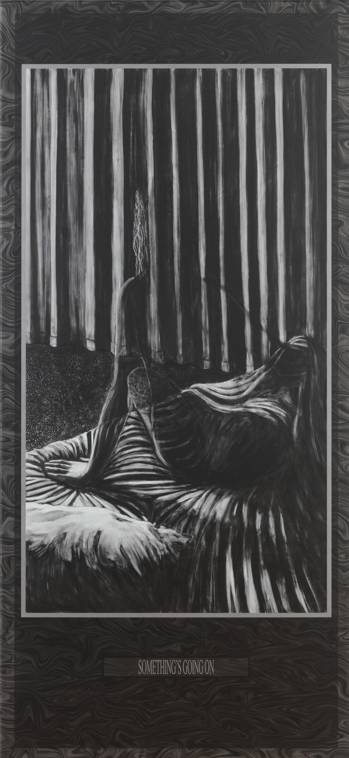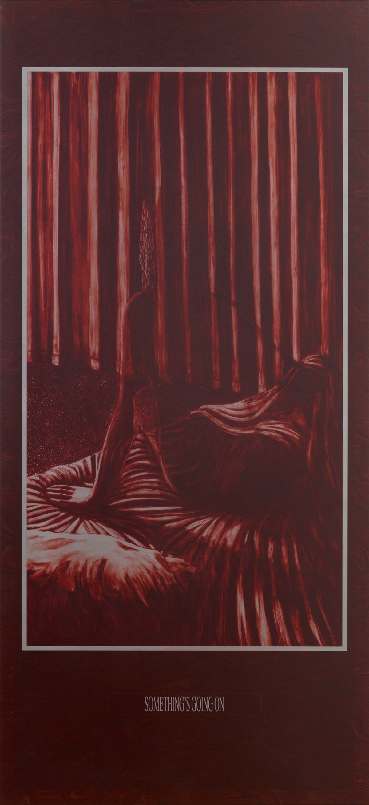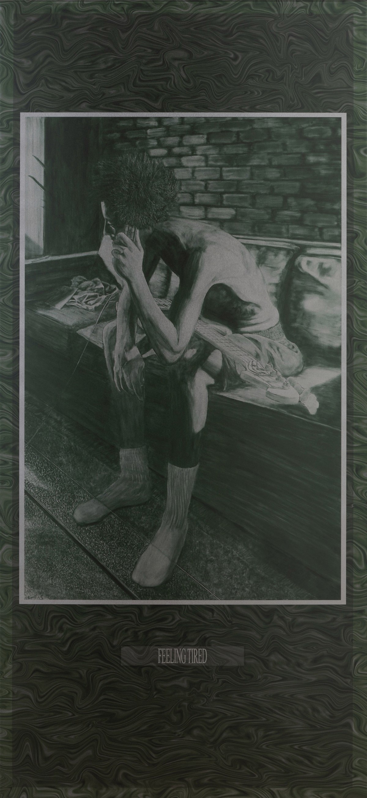 The prints are based off of the artist’s original paintings. The imagery focuses on intimate scenes of emotional moments, such as the work A Month, A Year, which depicts a woman seated on the edge of a bathtub, her head resting on her hand, appearing contemplative or somber. Painted during the Covid 19 pandemic, this image peers into a time of loneliness, fear, and self-care. Our Father Watches is a portrait of two boys in the ocean, one positioned under a crashing wave while the other rises above it. The figures stand as an emblem of community, for the ways in which we rise up when another is knocked down. A distant boat is visible on the horizon line, representing the unknown coming or going. The title refers to the presence of a being outside the frame, such as a parent, God, or teacher, who watches over, weighing the possibilities, circumstances, decisions, and consequences in every moment.