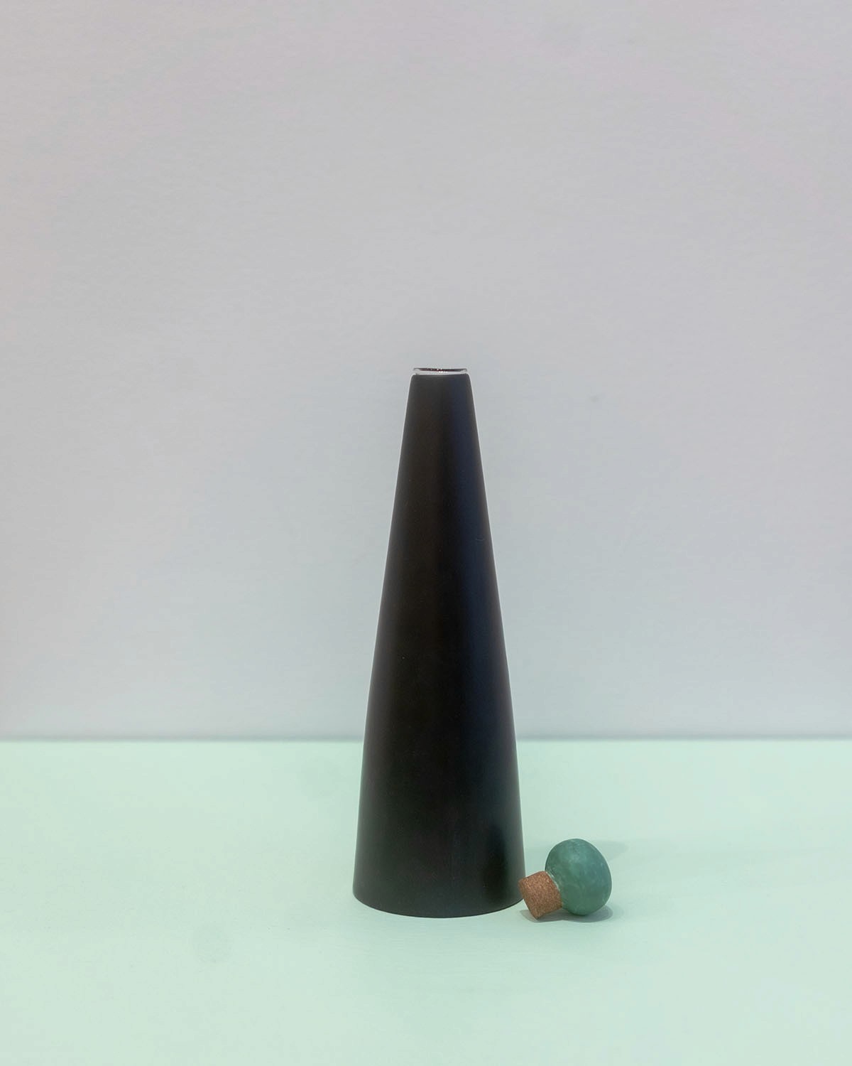 Magnetite pigment on cherry wood, with glass insert. Malachite pigment & cork stopper.