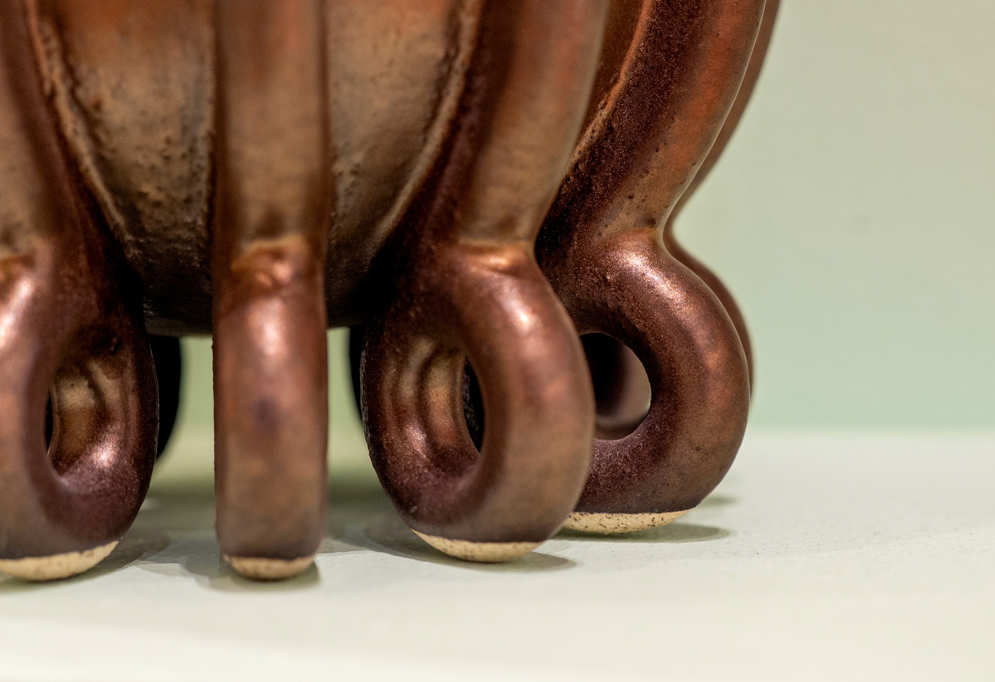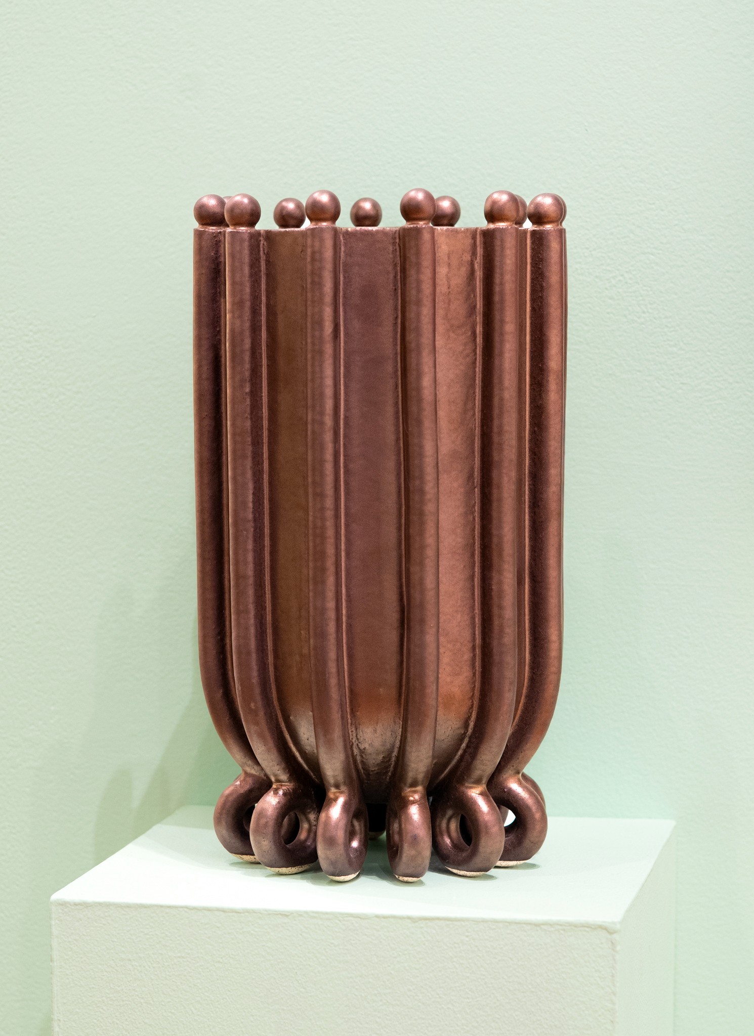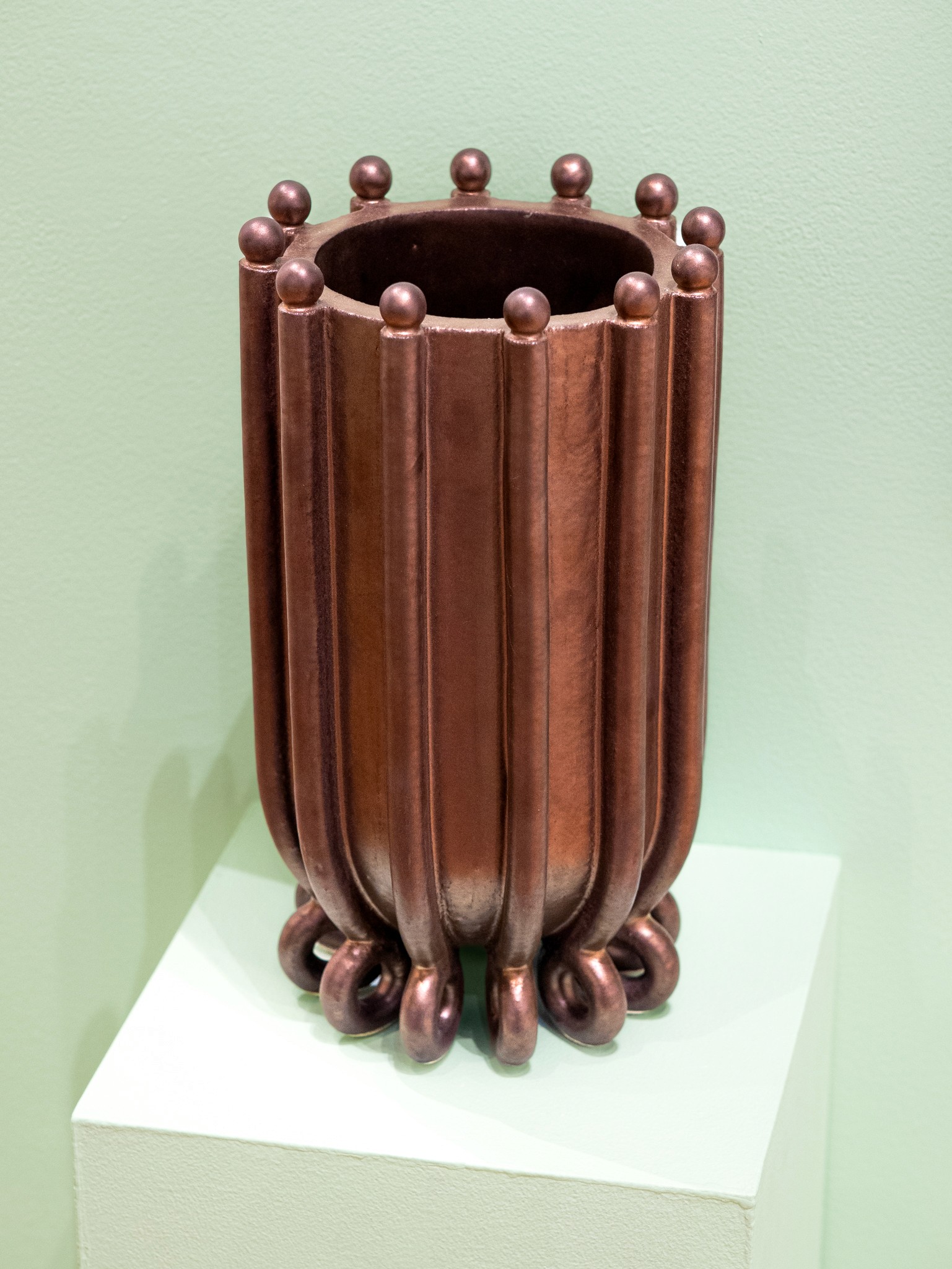 Devin Wilde’s vessel channels his architectural training into a sculptural object that feels both ancient and avant-garde. With its ridged columns and looping base, the piece plays with shadow and structure—hallmarks of Wilde’s design language.