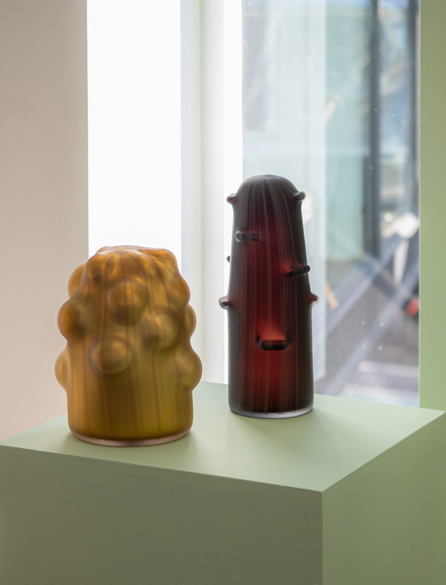 Blown glass, sand carved, silver mirror