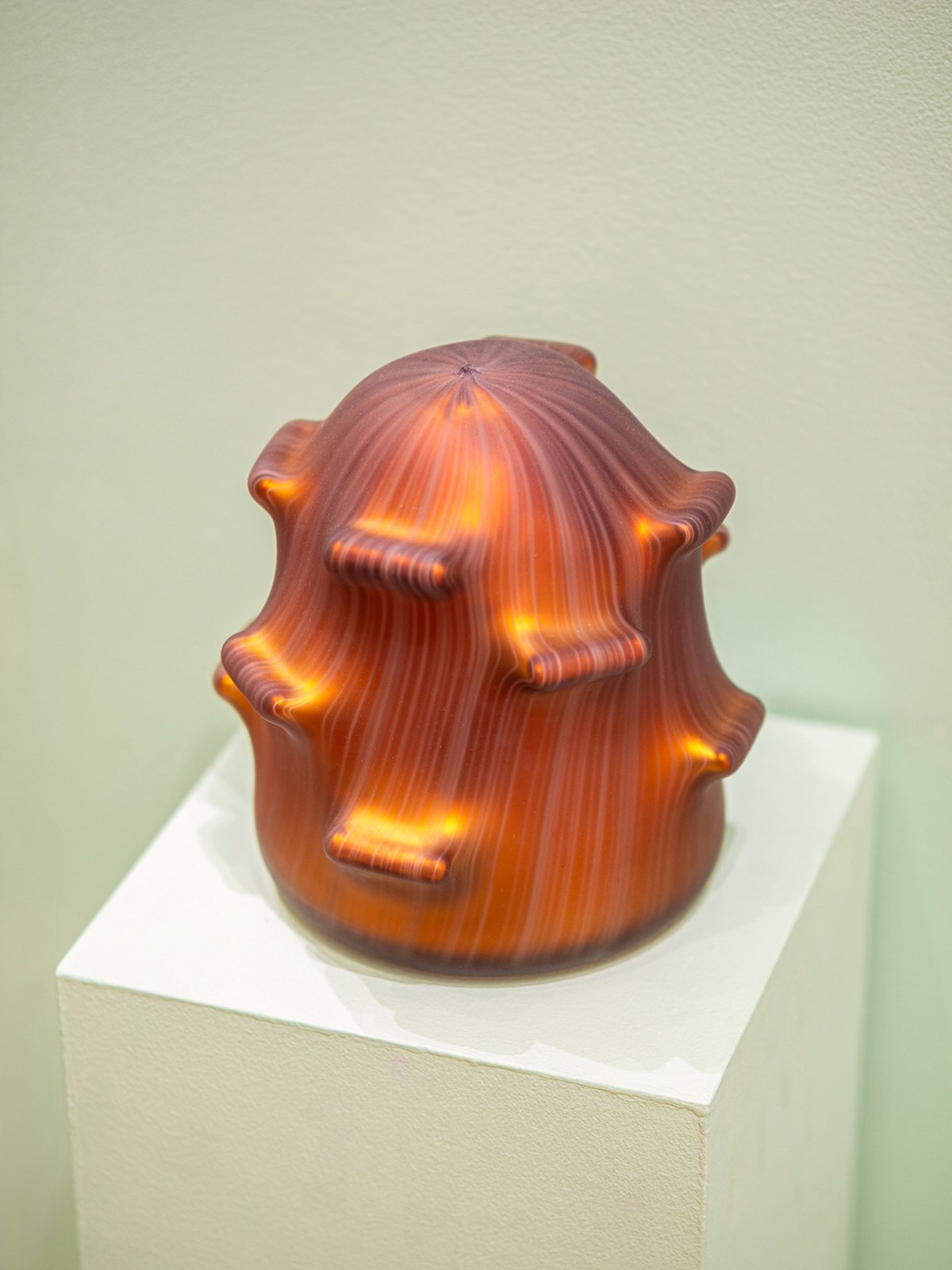 Though solid, the object feels fluid—like a form mid-transformation. It occupies a space where geology, biology, and imagination meet, a hallmark of Bell’s exploration into glass. Bell’s signature vertical striations run across the form like sediment lines or wood grain, subtly bending around each protrusion.