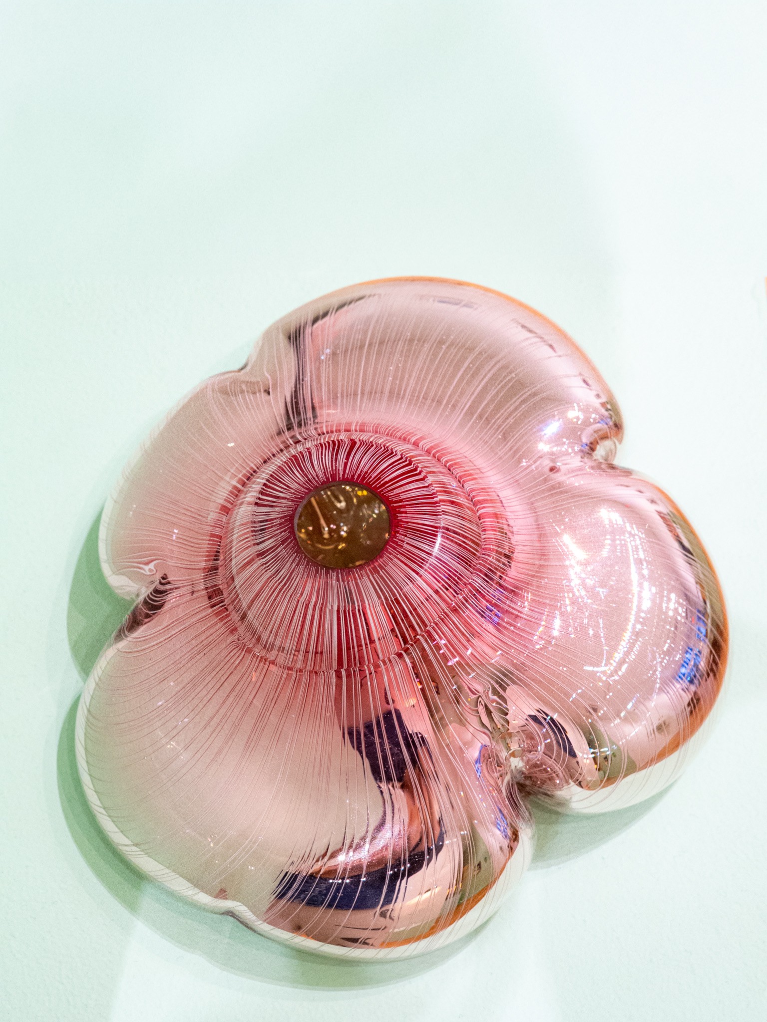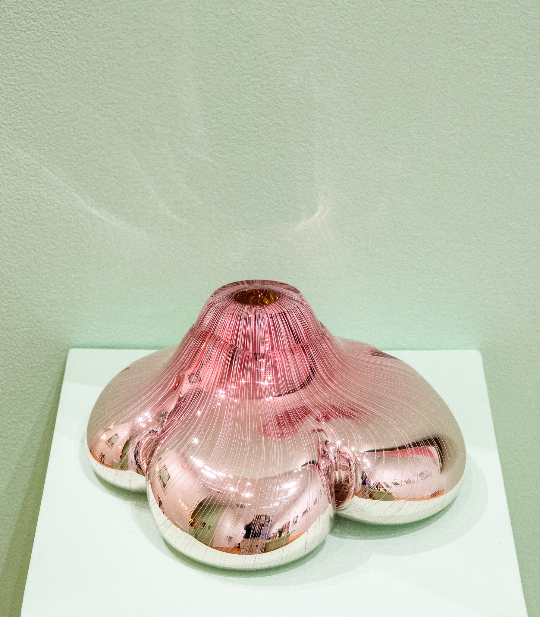 This glass sculpture is a striking example of Bell's explorations of fluid forms, optical distortion, and the expressive potential of blown glass. Its bulbous, tri-lobed silhouette feels as though it is gently expanding, collapsing, or melting—capturing a moment of flux frozen in time.