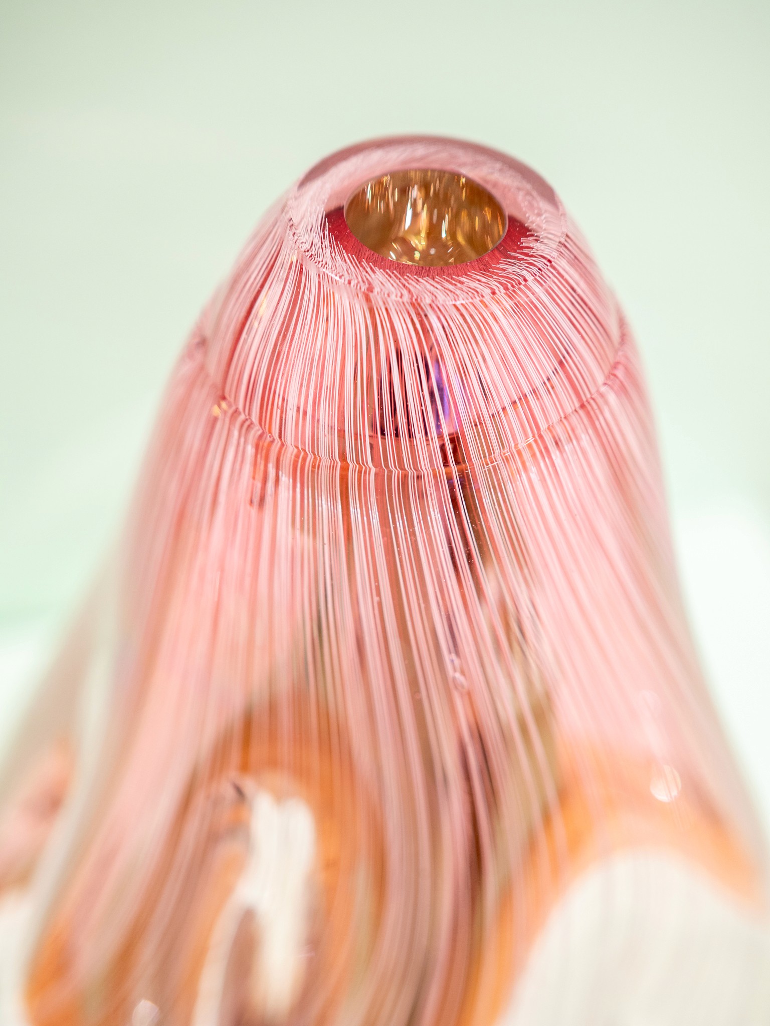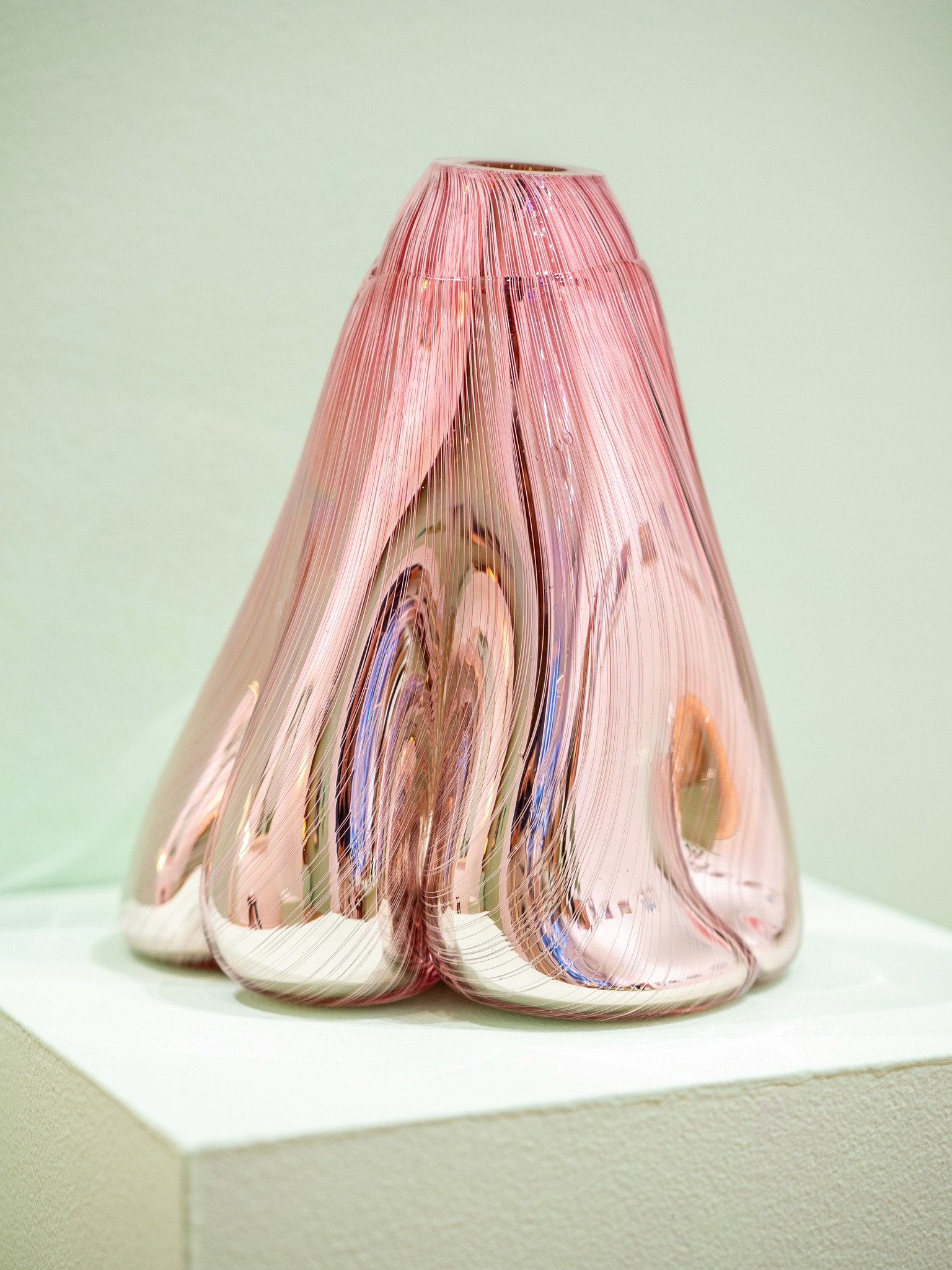 This glass sculpture is a striking example of Bell's explorations of fluid forms, optical distortion, and the expressive potential of blown glass. Its bulbous, tri-lobed silhouette feels as though it is gently expanding, collapsing, or melting—capturing a moment of flux frozen in time.