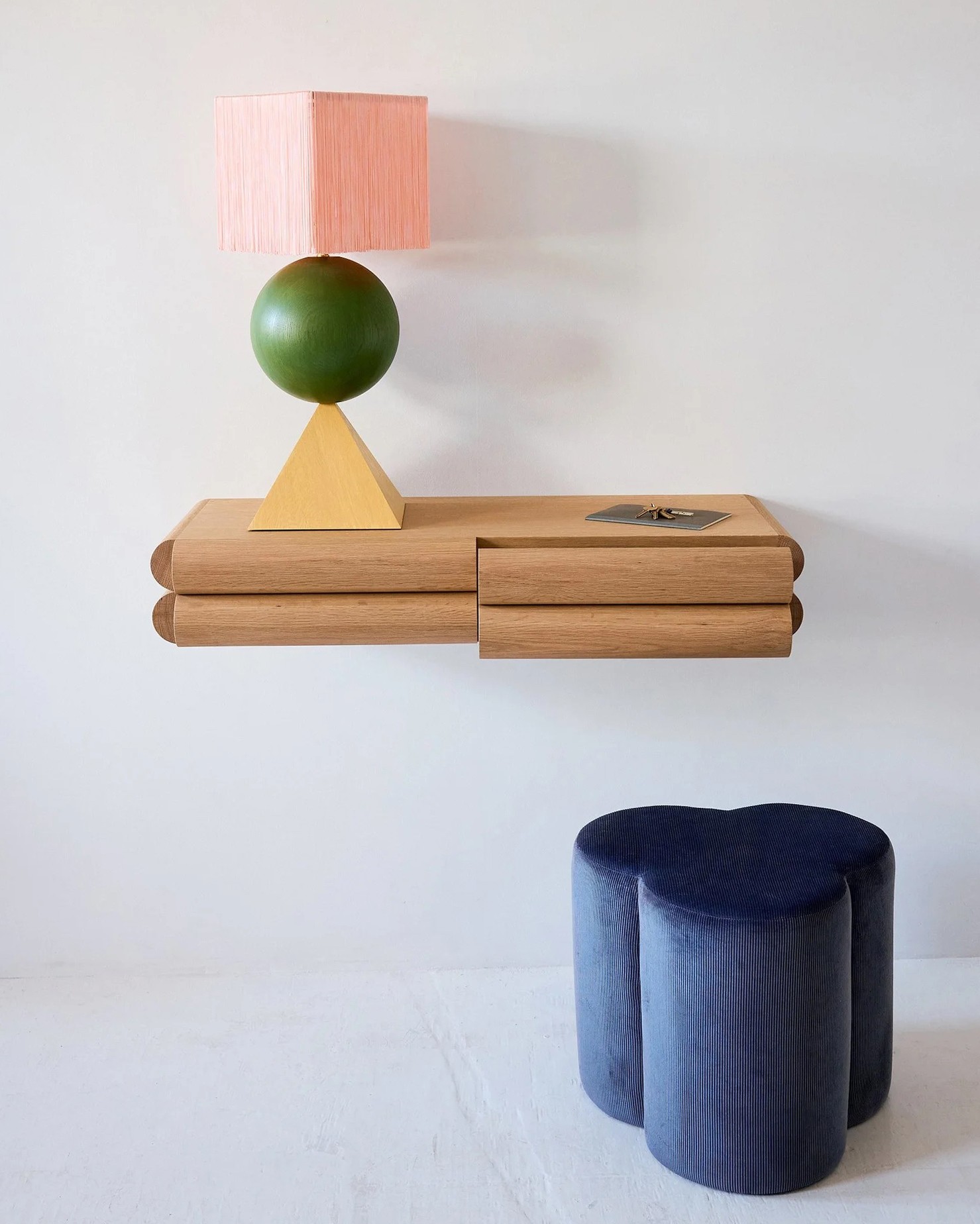 Solid white oak, linolie oil stain, brushed brass, handpainted fringe