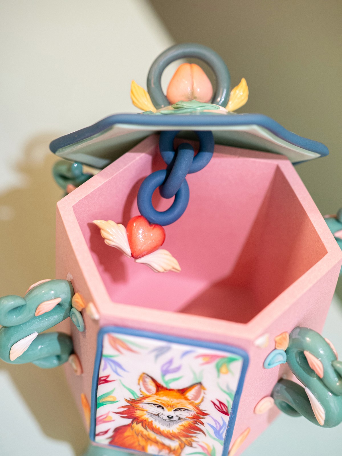 Blending British folklore with Chinese mythologies, Lim’s snuff-bottle sculpture pays homage to the foxes that roam her home city of London, sightings that feel magical. Made from Jesmonite resin and polymer clay, Lim often explores her two heritages, Singaporean and British, through her fantastical sculptures.