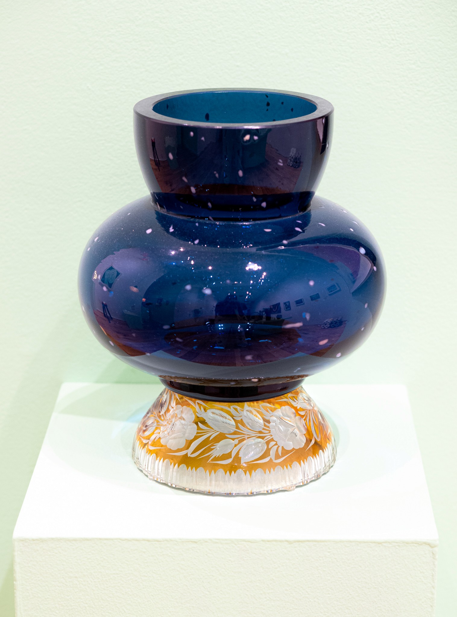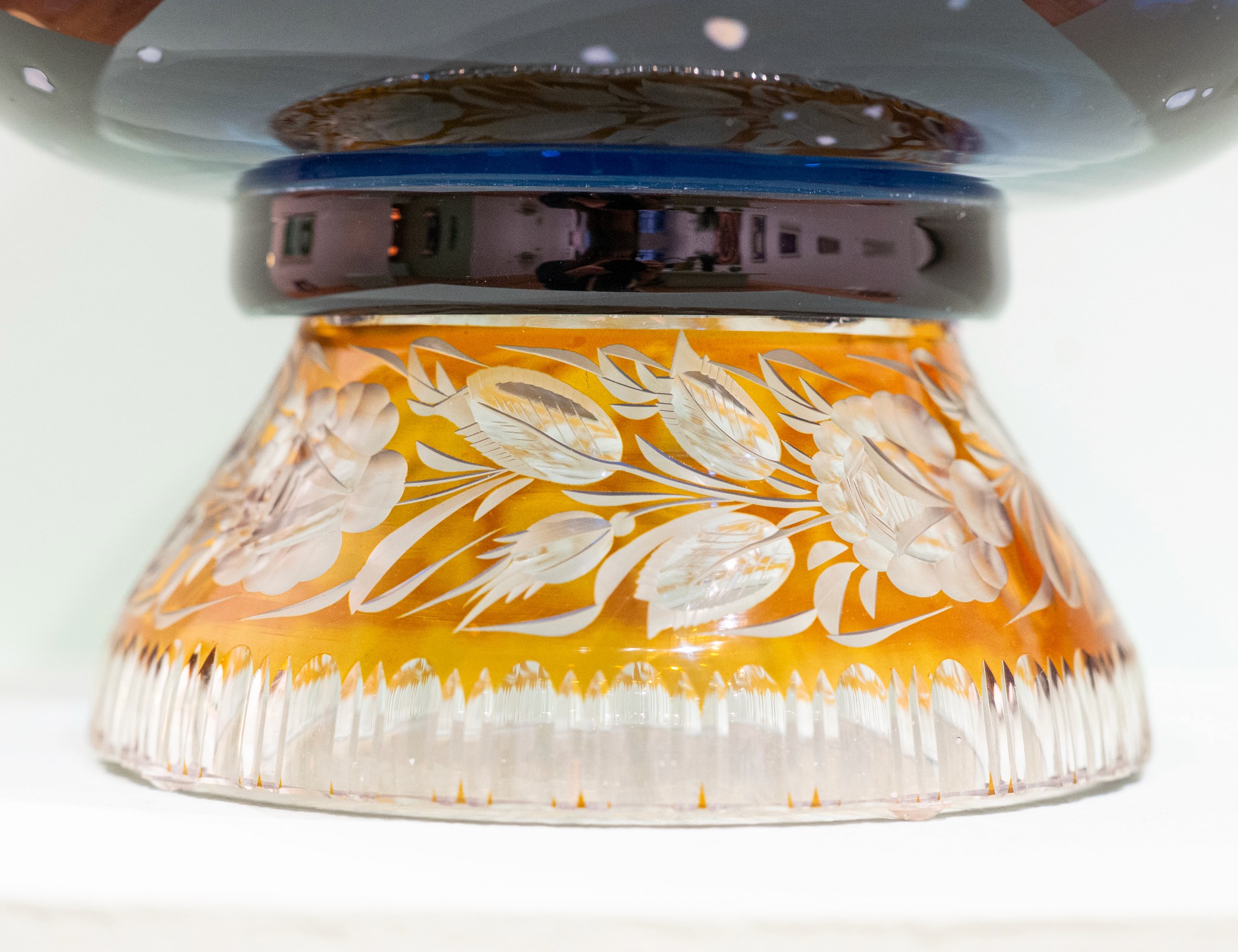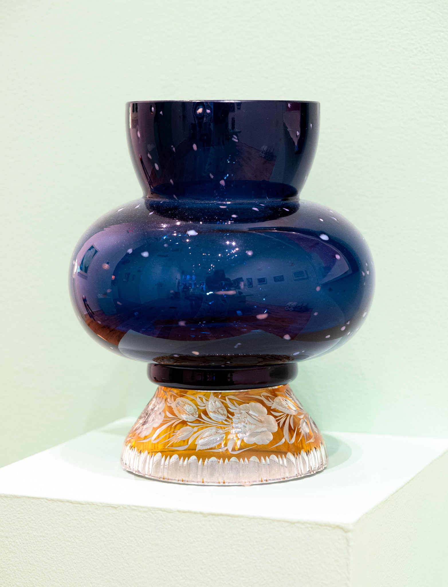 This one-of-a-kind vase unites restored 1920s Bohemian hand-cut glass – the amber base – with a newly mouth-blown cobalt blue form, creating a striking dialogue between past and present. Jiří honors the Czech glassmaking tradition of his homeland, while transforming rare collectibles into contemporary works of art.