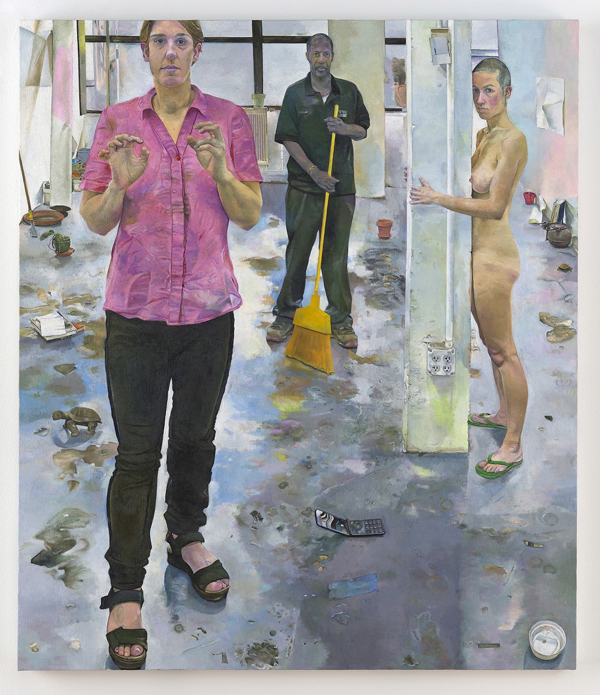 Joseph Santore reimagines the Annunciation, one of the most enduring themes in Renaissance art. The janitor from Santore's studio building poses as the archangel Gabriel, while models embody the two Mary figures. In Santore's version, Mary is the protagonist of her own story. “She presses her body against the column to experience a physical sensation, assuring her that she is young and alive in this world,” the artist explains. “The angel can come or go, raise his hand or broom at will, but that doesn’t mean she has to be happy with the way God is entering her.” Through this contemporary recasting, Santore explores the conflicts we all face; do we accept what’s offered to us, do we reject it, or do we really have a choice?