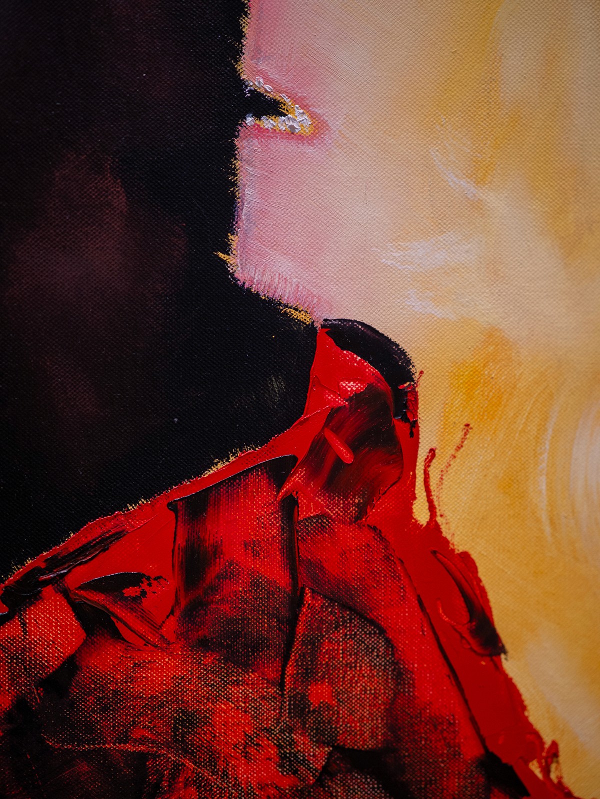 Adorned in gold, Agamemnon emerges as both conqueror and victim of fate. The legendary King of Mycenae led the Greek forces to victory in the Trojan war, only to return home to death at the hands of his vengeful wife. His story embodies the brutal cycle of vengeance that exposes humanity’s fundamental flaws. Liu applies subtle flesh and pink tones around the figure’s nose and mouth, grounding this golden king in mortal reality. These delicate touches remind us that Agamemnon was no deity but a deeply flawed human being, consumed by ambition and undone by the consequences of his choices. In Liu’s vision, imperfection becomes the most profound marker of existence itself. Through Agamemnon’s tragic grandeur, the artist suggests that our flaws do not diminish us but rather affirm our humanity in all its complex, contradictory glory.