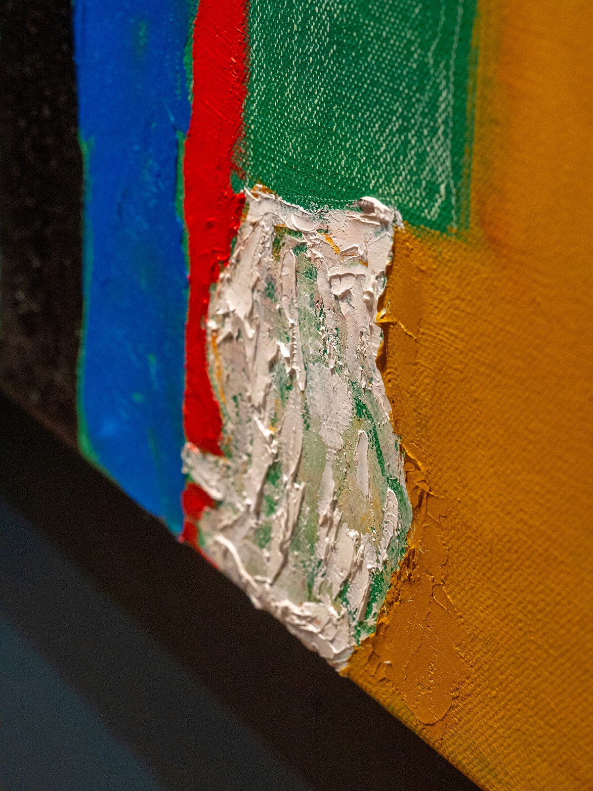Leonard Cohen once sang, “You lose your grip, and then you slip into the masterpiece.” "Losing Grip" depicts precisely that moment of derailment in life. Though it may be unwilling and inevitable, if one navigates the experience thoughtfully, losing control can lead to a space of revelation. The central figure tilts their head, the hair falling in the same direction as the right arm, emphasizing surrender. The skeletal left hand suggests the weight of the past, or a sense of loss, while the red strip positioned between the arm and leg appears as a portal to another dimension, as though reality itself has been torn open. This painting honors the truth that happiness and new beginnings often require letting go of something.