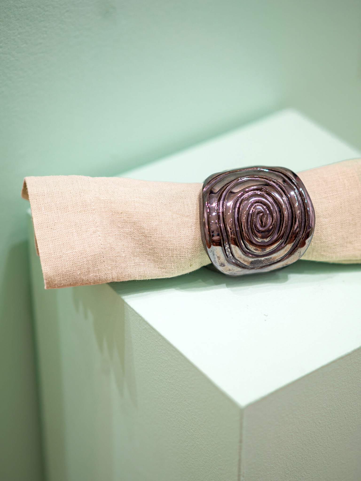 Clarissa Guzman creates bespoke options for everyday items like napkin rings and doorknobs. Her work is influenced by nostalgia for her childhood in Texas and Mexico, blended with her current influences, including Brutalism and religious relics.
