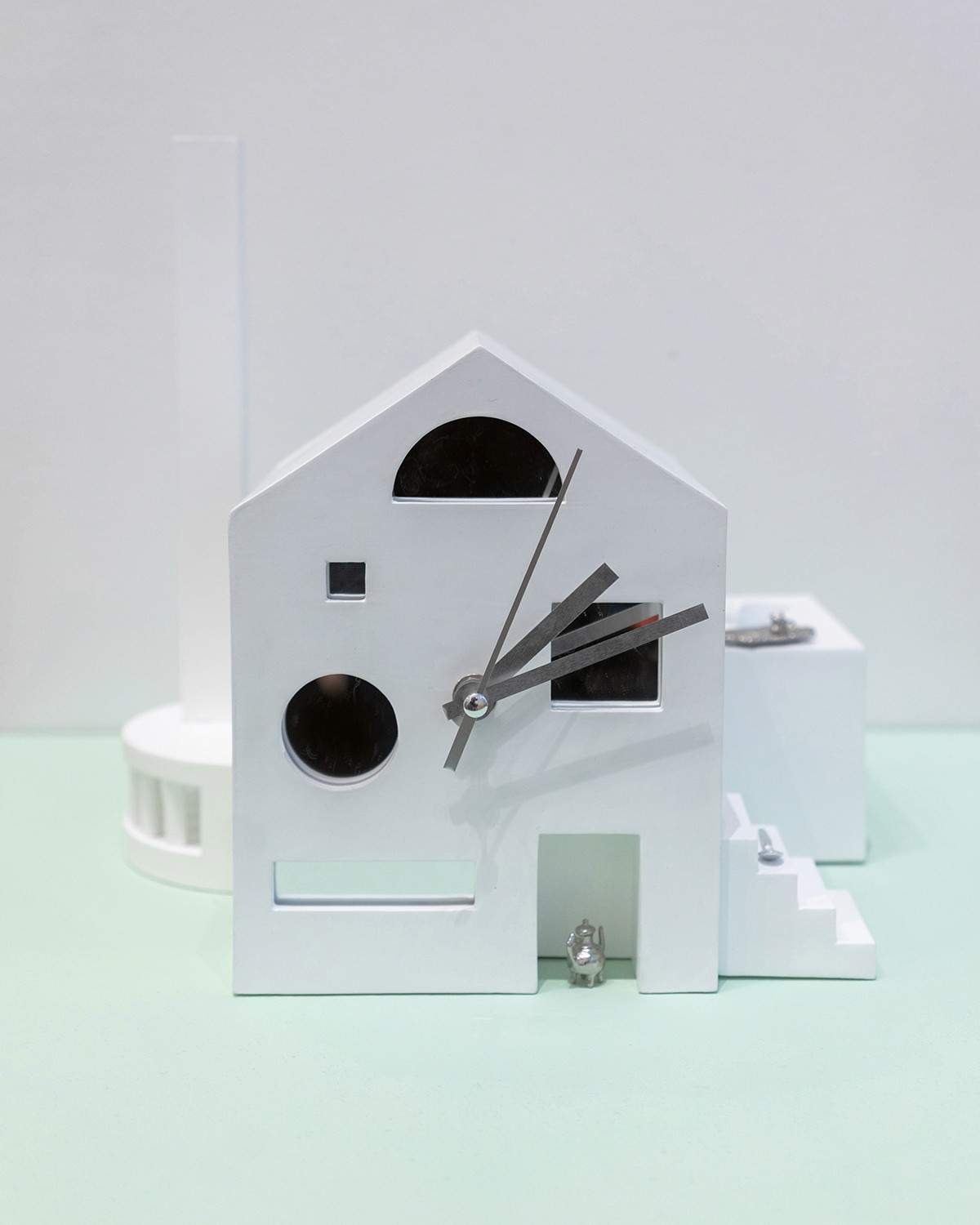 Plywood, latex paint, mirrored acrylic, clock mechanism