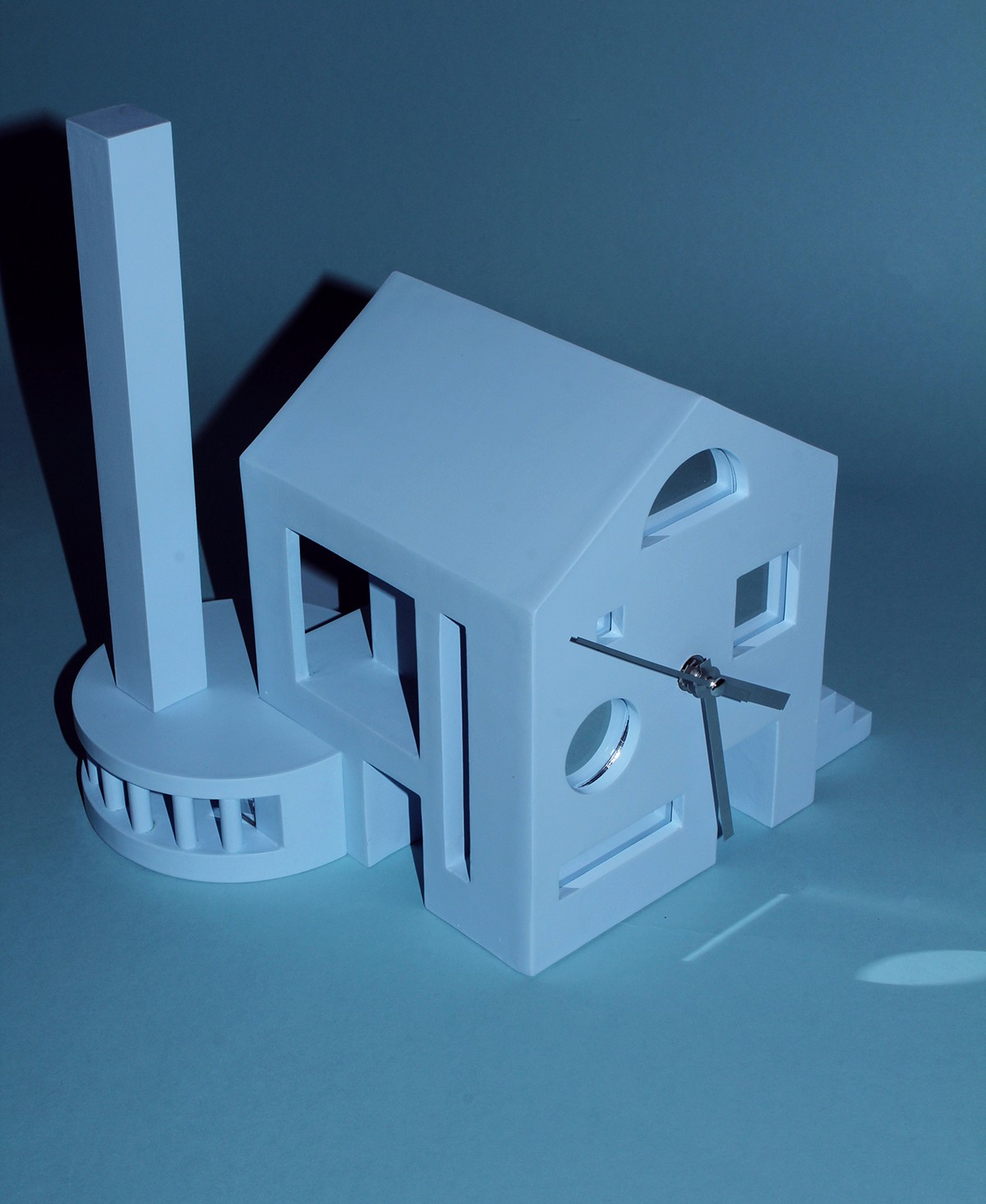 Plywood, latex paint, mirrored acrylic, clock mechanism