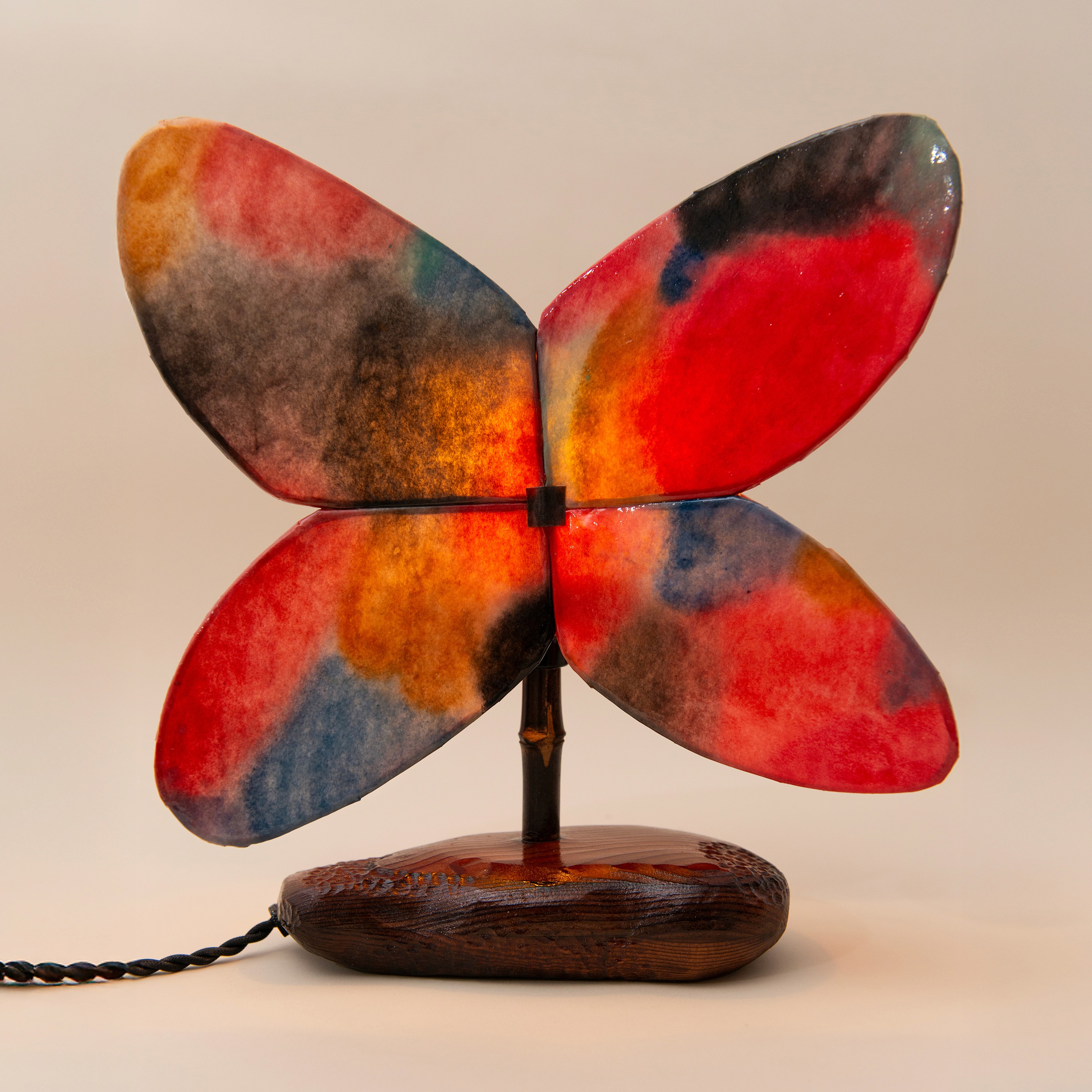 Reclaimed vintage redwood and pine, paper, bamboo, shellac, mineral pigment, LED component