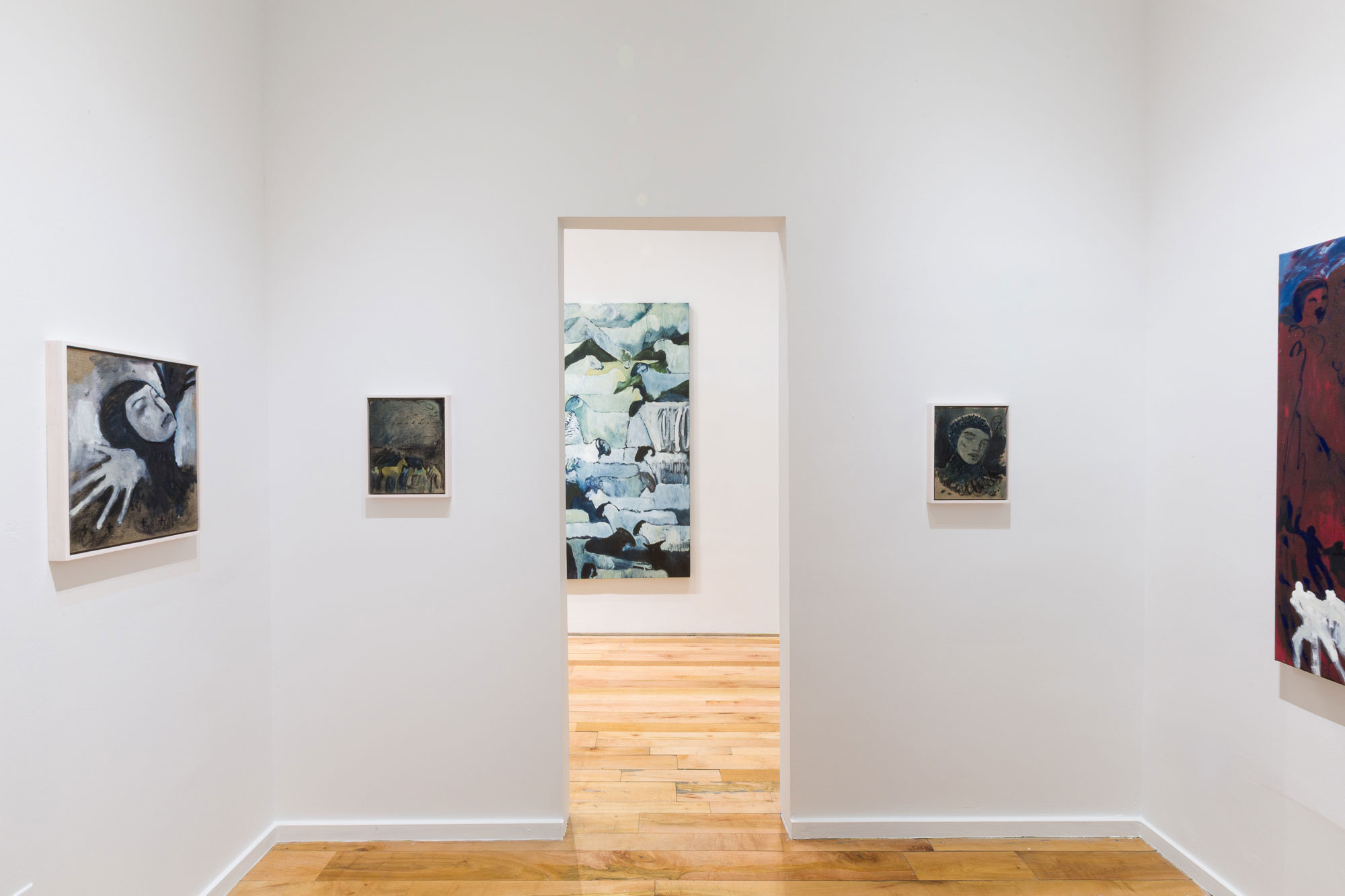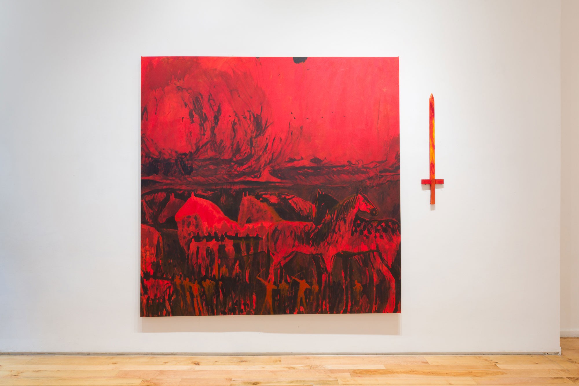 In several paintings, a red register enters like a front moving in. Figures emerge as luminous silhouettes rendered a molten red, the same red as the blood in our bodies or the core of the earth. They appear in states of urgency, release, ascent, or collapse. Surfaces stay active, keeping the image in motion. In these red paintings, the land turns ember-hot. The figures flare up like sparks thrown from a bonfire, running, falling, lifting their arms into a sky that feels too big for the human body.